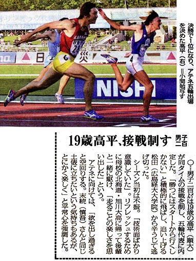 アテネ五輪の日本代表を兼ねた第88回日本陸上競技選手権大会が6月4日~6日鳥取県立布勢総合運動公園陸上競技場で行われ、高平慎士(スポーツ科学科2年)が五輪参加A標準記録の20秒59で優勝し、代表に内定しました。(6月6日毎日新聞)