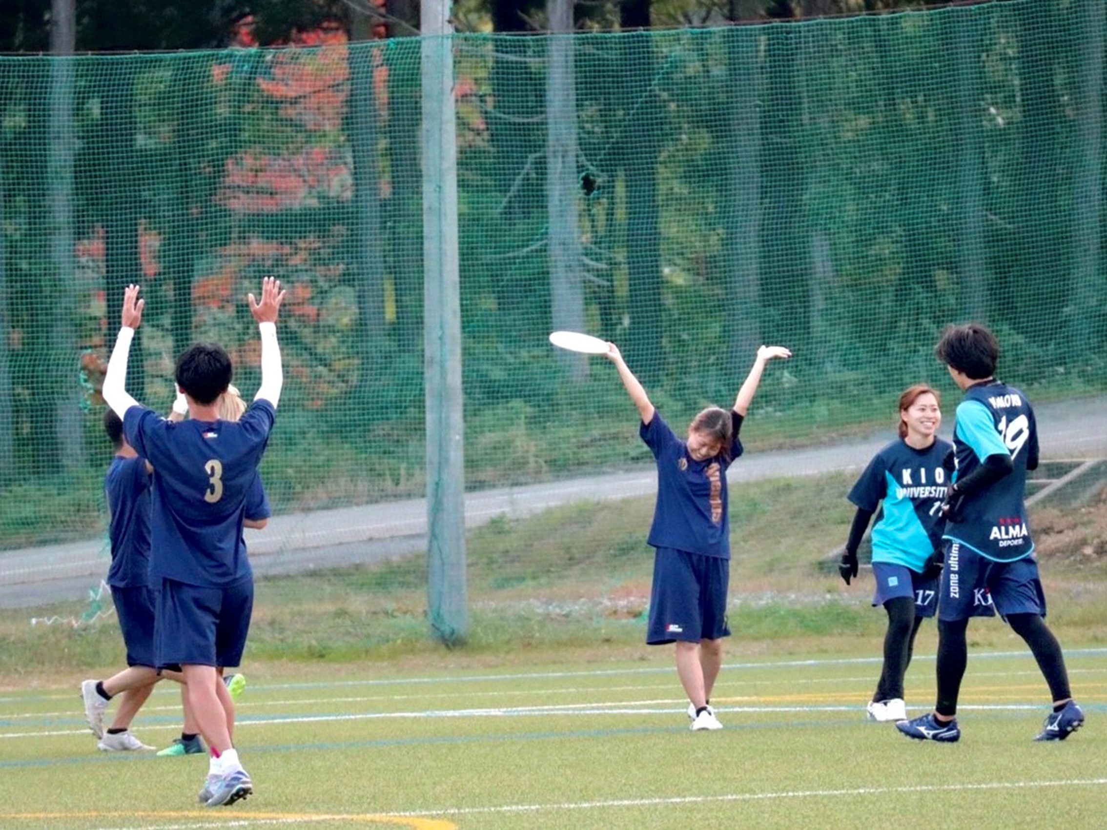アルティメット同好会は、現在4年生である先輩方が2年前に同好会を設立され、コロナ禍の中あまり思うような活動ができず、1年間の流れが作られていない状態から2年生である私に主将が受け継がれたため、右も左も分からないまま新入部員を向かい入れましたが、先輩方や同輩の手厚いサポート、後輩たちのアルティメットに対するやる気や雨の中でも練習したいという根性、協調性があって楽しい雰囲気づくりにより、2022年度の1年間の活動は部員全員にとってかけがえのないものとなりました。