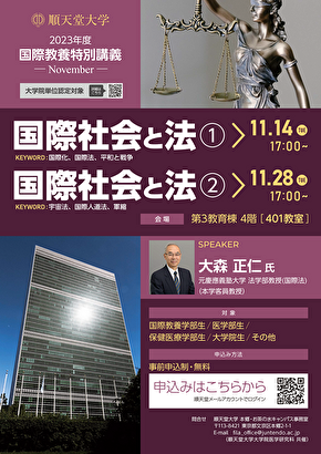 大森 正仁 氏 (本学客員教授/元慶應義塾大学法学部教授) 「国際社会と法」 北岡 伸一 氏 (JICA特別顧問(前理事長)/東京大学名誉教授) 「国際協力と国際政治」 鈴木 大地 氏 (スポーツ健康医科学推進機構 機構長/