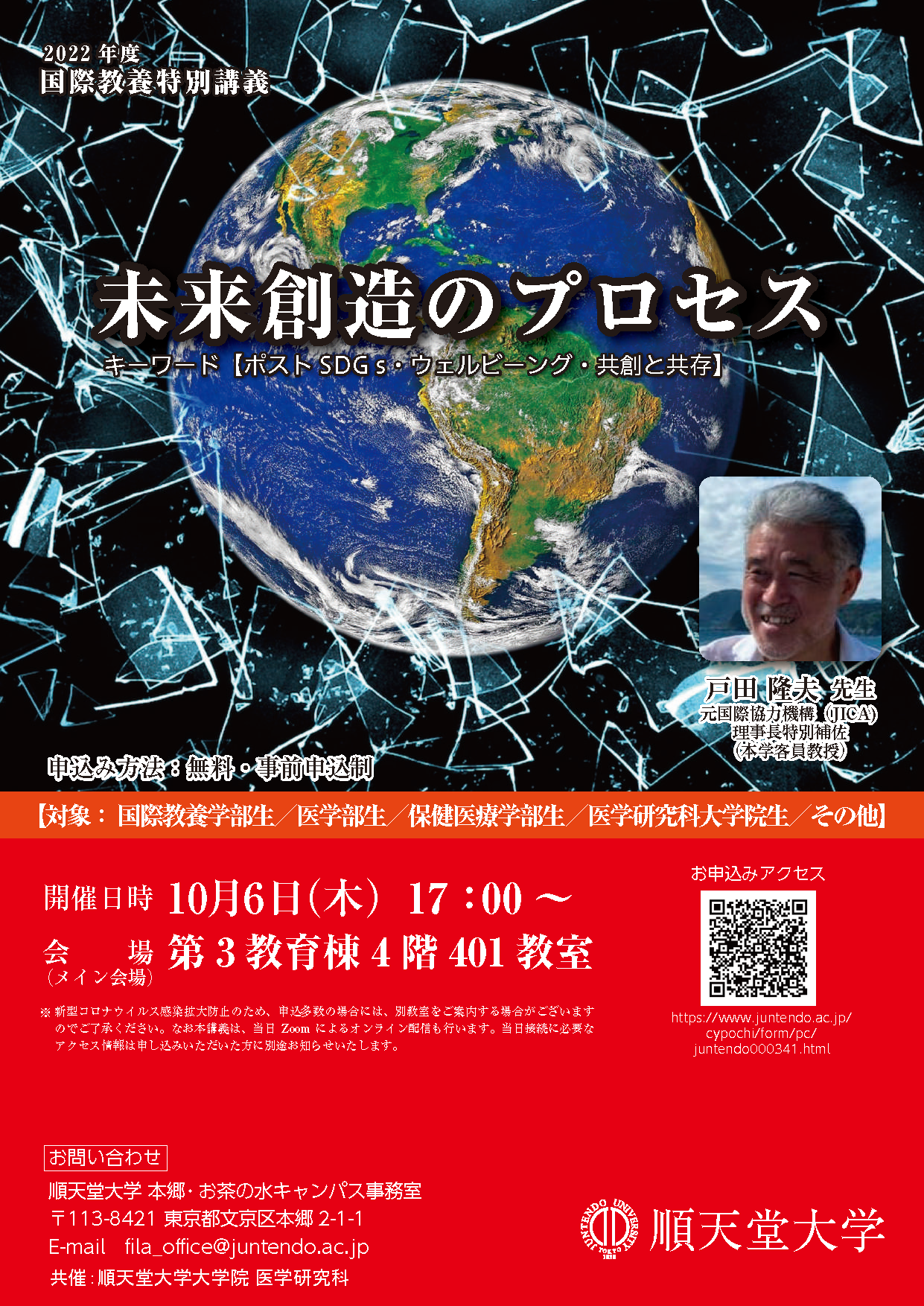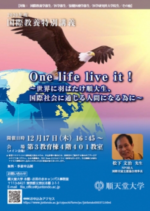 講師名(五十音順) テーマ 赤阪 清隆 氏 (元国連広報担当事務次長) 「これからの世界と日本の若者-不確実な時代をどう生きるか?」 池上 彰 氏 (本学特任教授/ジャーナリスト) 「ポストコロナのグローバル社会に生きる」 久留宮 隆 氏 (国境なき医師団日本/会長) 「国際医療援助活動における人道主義」 道傳 愛子 氏 (本学客員教授/NHK国際放送局) 「どう生きる パンデミックの世界」 戸田 隆夫 氏 (JICA/理事長特別補佐) 「人間の安全保障と日本」 長坂 優子 氏 (特定非営利活動法人日本リザルツ・ケニア駐在員) 「アフリカの保健体制の課題と新型コロナウイルス:ケニアからの現場報告」 平松 礼二 氏 (本学客員教授/日本画家) 「国際教養としての日本美学」 松下 文治 氏 (本学客員教授/国際交流支援協会理事長) 「One life live it ! 〜世界に羽ばたけ順大生、国際社会に通じる人間になる為に〜」