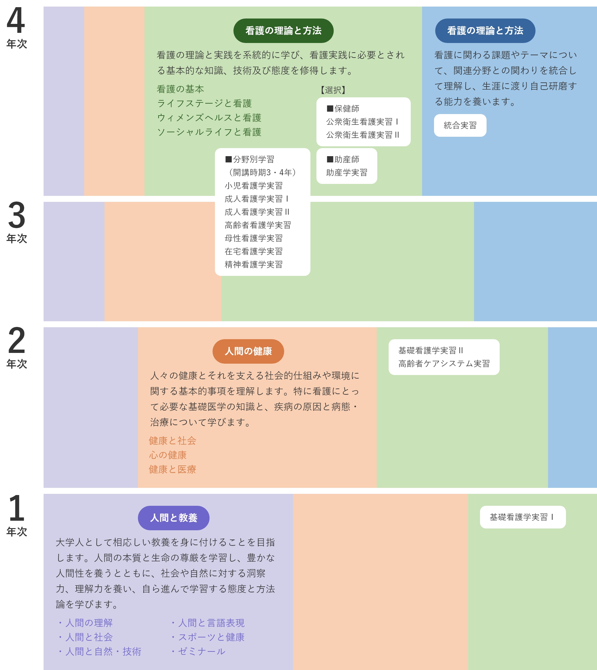 4つの科目群「人間と教養」「人間の健康」「看護の理論と方法」「医療看護の統合と発展」からなるカリキュラムを編成することで、段階的に理解を深めるようにしています。