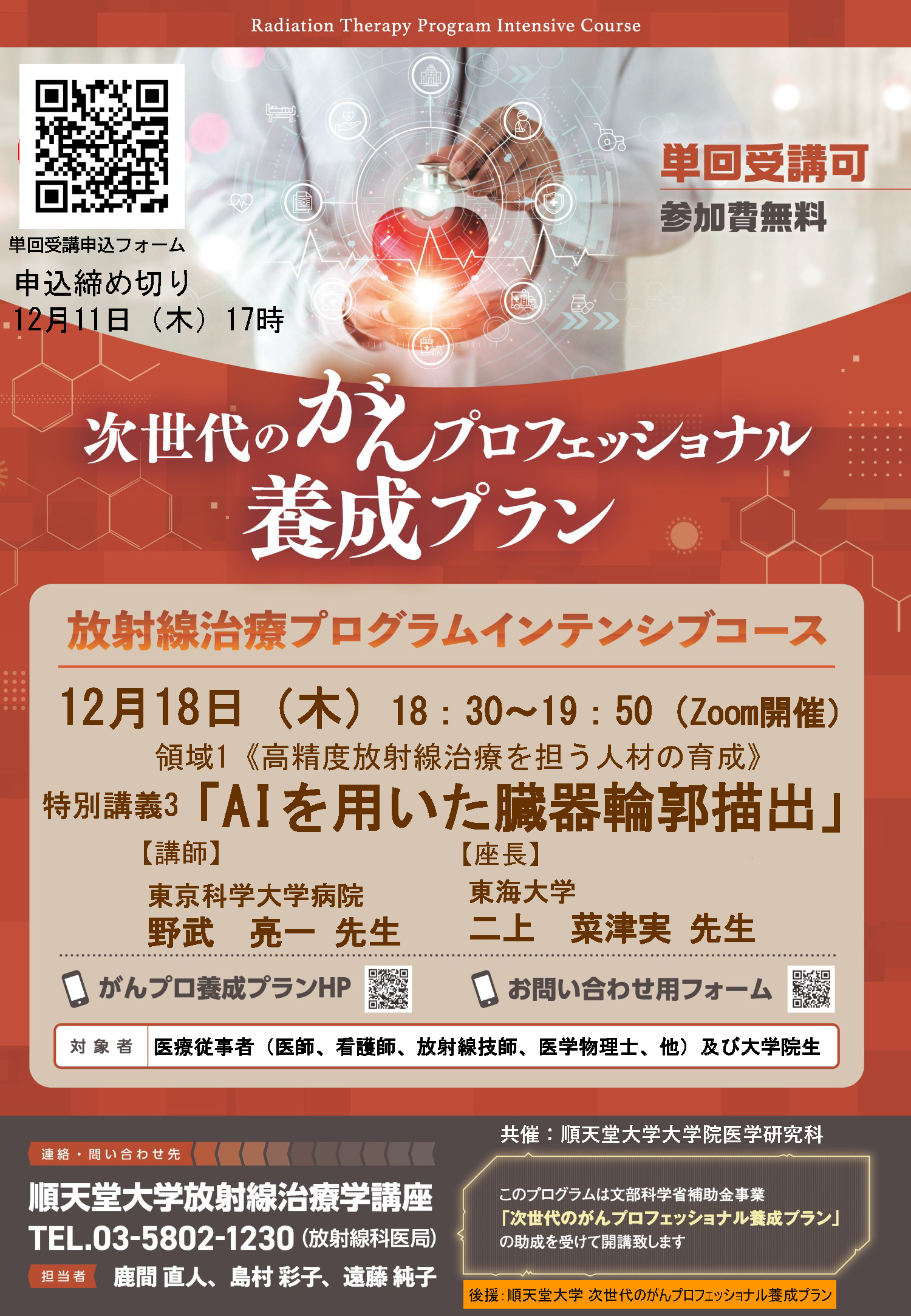 | 緩和的放射線治療・密封小線源治療・高精度放射線治療の質の向上と普及を担う人材養成コース③「チームで取り組む緩和的放射線治療」 | 順天堂大学 | ||