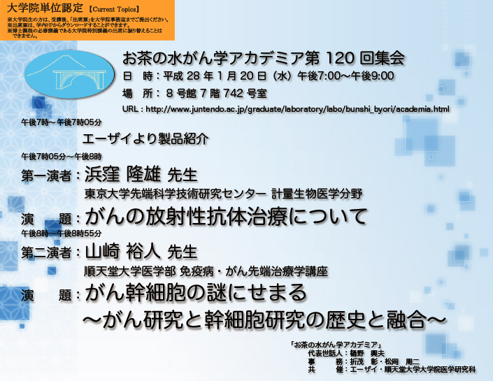お茶の水がん学アカデミア第120回集会 平成28年1月20日(水)19時〜21時 場所:8号館7階742号室