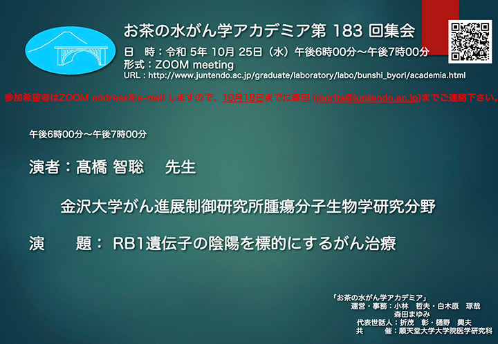 お茶の水がん学アカデミア第183回集会 2023年10月25日(水)18:00〜19:00 場所:ZOOM