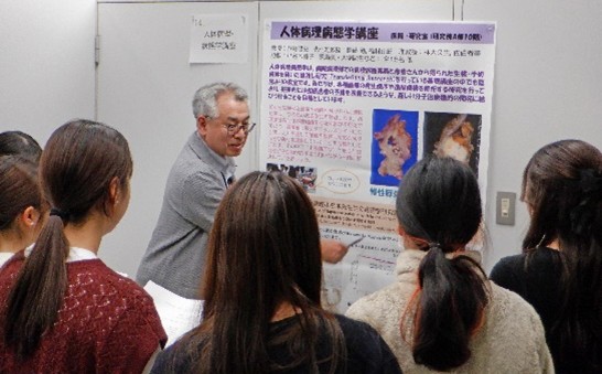 参加してくれた学生は、すべての研究室についてポスターの前で簡単な研究内容の紹介を受け、さらに各自の興味のある研究室については個別の説明を熱心に聞いていました。