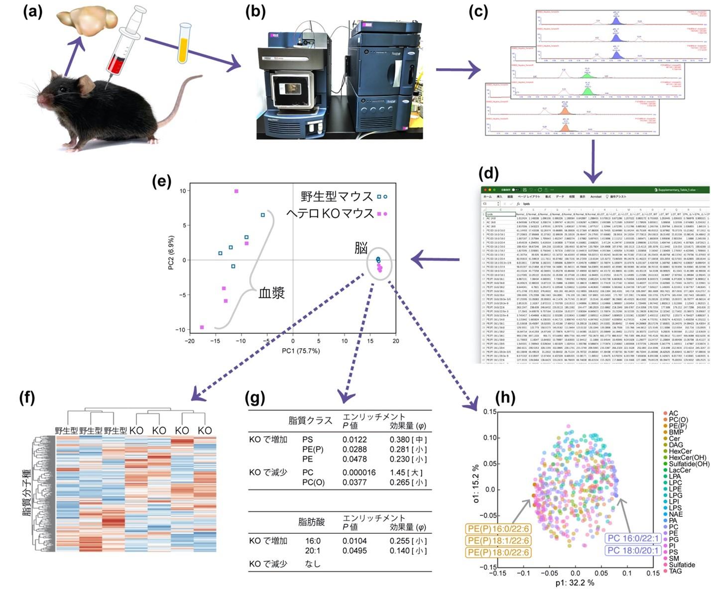(a)マウスから脳と血液を採取して総脂質を抽出し、(b,c) LC-MS/MSを用いて400種以上の脂質分子を測定した。(d)得られた大量のデータを、(e〜h)さまざまな統計学的・情報科学的手法で解析した。脳と血漿の脂質パターンは大きく異なっており、血漿の脂質は個体差が大きいのに対して、脳の脂質は一定に保たれている。しかし、正常マウスとヘテロKOマウスでは有意に異なり、その違いについてクラスタリング、エンリッチメント解析、判別分析などの解析を行い、濃度が変化している脂質分子種、脂肪酸、脂質クラスが明らかになった。