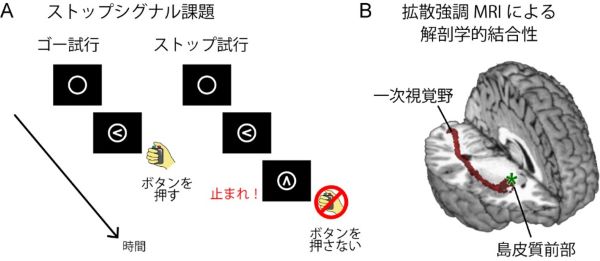 (A) 被験者は、画面に表示された左向きまたは右向きの矢印と同じ方向のボタンをできるだけ早く押すよう指示されます(ゴー試行)。また、一定の割合で、左右の矢印が表示された直後に上向きの矢印に変わる場合があります(ストップ試行)。その際、被験者はボタンを押さないよう求められます。ボタンを押さずに止まれる場合と、止まれず押してしまう場合がありますが、この課題では成功率が約50%になるよう、上向き矢印に変わるタイミングが被験者の成績に応じて調整されます。(B) 拡散強調MRIにより、一次視覚野と島皮質前部の解剖学的結合性が確認され、反応抑制の過程で一次視覚野から島皮質前部に情報が伝達されることが明らかになりました。