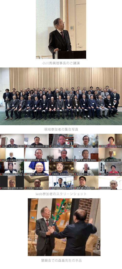 小川秀興 理事長(昭和41年卒)を会場にお迎えし、まず、現地で集合写真の撮影を致しました。金井美紀 渉外・支部担当理事(昭和61 年卒)の司会で開会となり、宮川政久 会長(昭和39年卒)のご挨拶がありました。そして、小川理事長による「順天堂大学の近況」と題したご講演がありました。その後、web 参加の皆様の写真をスクリーンショットで撮影しました。